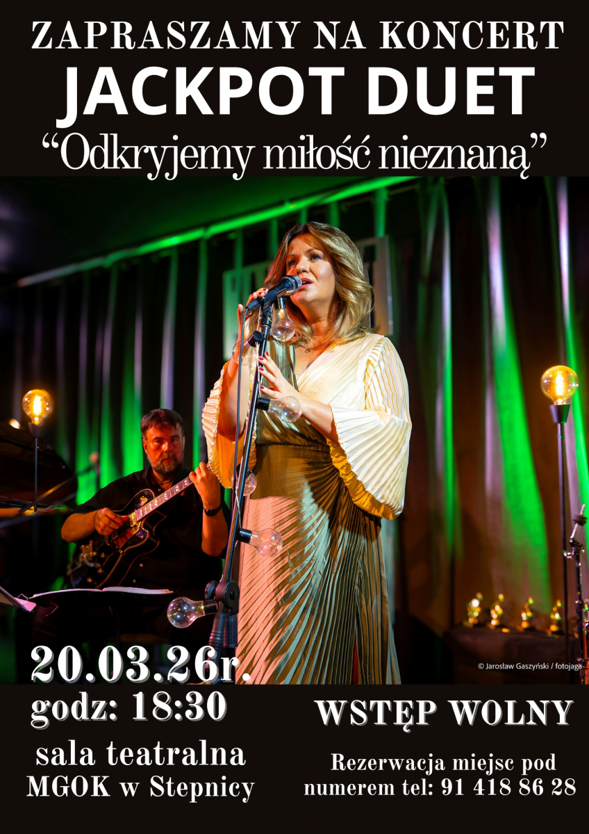 Miejsko-Gminny Ośrodek Kultury w Stepnicy zaprasza 20 marca (piątek) o godz. 18:30 na Koncert duetu Jackpot „Odkryjemy miłość nieznaną” – koncert małżeństwa muzyków, pedagogów i ludzi o niezwykłej wrażliwości. Artyści są finalistami jubileuszowej, 10. edycji programu „Must Be The Music”.