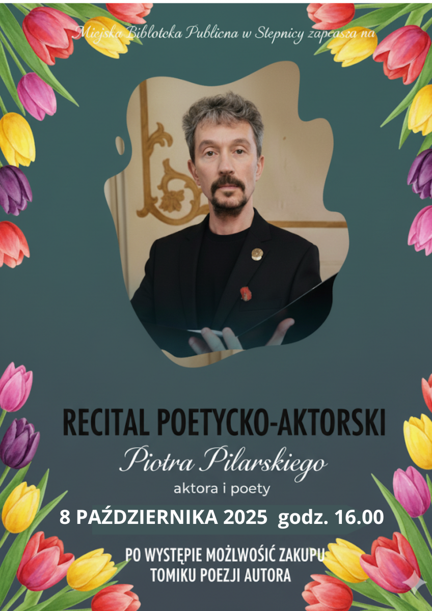 Miejska Biblioteka Publiczna w Stepnicy zaprasza 8 października 2025 r. o godz. 16:00 na Recital Poetycko-Aktorski Piotra Pilarskiego – aktora i poety.