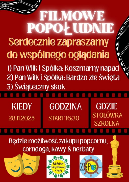 Zespół Szkolno-Przedszkolny w Stepnicy, Rada Rodziców oraz Samorząd Uczniowski zapraszają na „Szkolne Kino”, które odbędzie się w piątek, 28 listopada, w stołówce szkolnej.